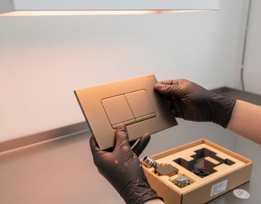 As the final step, we re-assemble the component where necessary, and then perform a rigorous final quality review. Following this, the customised product—for example, the transformed flush plate—is securely packaged and prepared for return, exhibiting its robust and elegant finish.